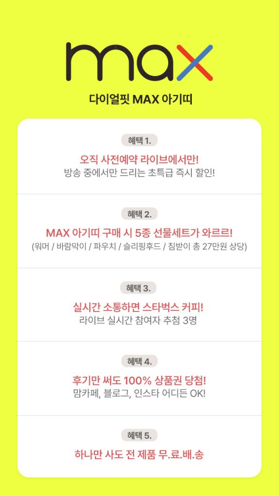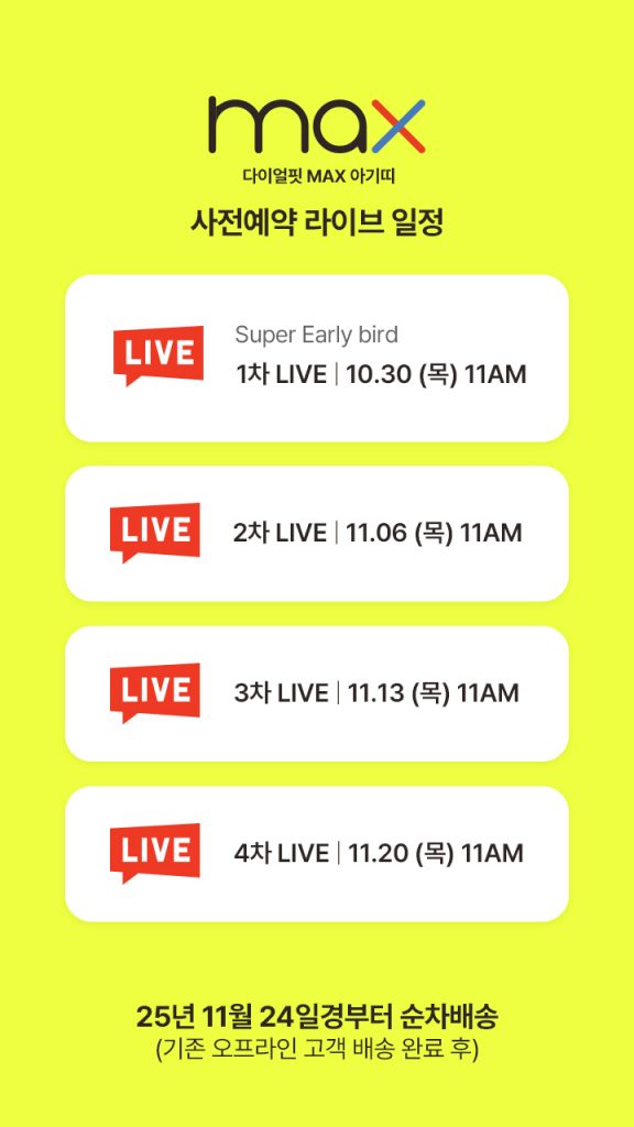 이번 4주간 런칭 WEEK에서는 총 4회의 LIVE를 통해서 그 동안 오프라인 베페 사전예약 행사에서만 만나실 수 있었던 가격 혜택과 풍성한 사은품 혜택으로 MAX를 만나실 수 있어요.